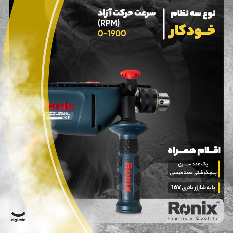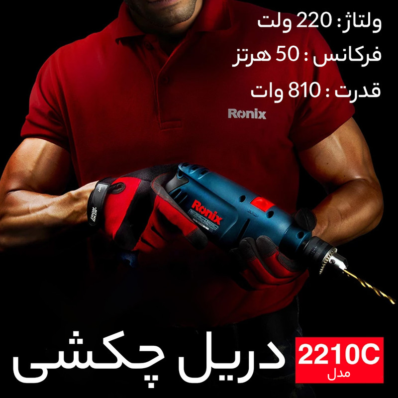 انواع دریلها را از نظر ساختار میتوان به دریلهای ستونی و قابل حمل تقسیم کرد. دریلهای تخریب هم در هر دو گونهی برقی و شارژی قابل تهیه هستند؛ پیستون واقعی درنظر گرفته شده برای این دریلها در مقایسه با دریلهای چکشی معمولی قدرت ضربه و تخریب بیشتری دارند. بارزترین تفاوت میان دریلهای تخریب و دریلهای چکشی هم توانایی ضربه زدن با نوک ابزار نوع پیستونی، آنهم بدون چرخش ابزار است؛ در حالی که در نوع معمولی یا چکشی چنین امکانی فراهم نیست. انواع دریلهای شارژی امروزی معمولا از باتریهای نیکل-کادمیوم یا لیتیومی استفاده میکنند. حتی انواع چکشی این دریلهای شارژی هم در ابعاد بسیار کوچک وجود دارند. دریل C2210 از شرکت رونیکس نیروی خود را از طریق برق شهری تامین میکند. بیشینه سرعت دوران این دریل 3000 دور بر دقیقه است. این دریل توانایی چرخش در دو جهت را دارد. با استفاده از این دریل قادر خواهید بود سوراخهایی حداکثر با قطر 13 میلیمتر در فلز و 13 میلیمتر در سیمان یا مصالح مشابه، ایجاد کنید. این دریل با داشتن قابلیت چکشی و توان 810 دریلی مناسب برای مصارف خانگی و تجاری است.