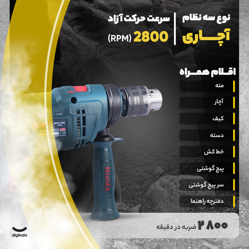 سه نظام این دریل از نوع آچاری تمام فلزی و به ظرفیت 13 میلی متر است که برای تعویض نیازمند آچار مخصوص می باشد. از دیگر ویژگی های کیت دریل چکشی 13 میلی متری رونیکس می توان به برخورداری از دیمر کنترل سرعت و کلید چپ گرد و راستگرد اشاره کرد که امکان باز و بسته کردن پیچ را فراهم می کند. در ضمن مدل RS-0001 رونیکس از وزن سبک و طراحی ارگونومیک برخوردار است و گزینه ای مناسب برای سوراخ کاری سطوح مختلف چوب، فلز و بتن می باشد.